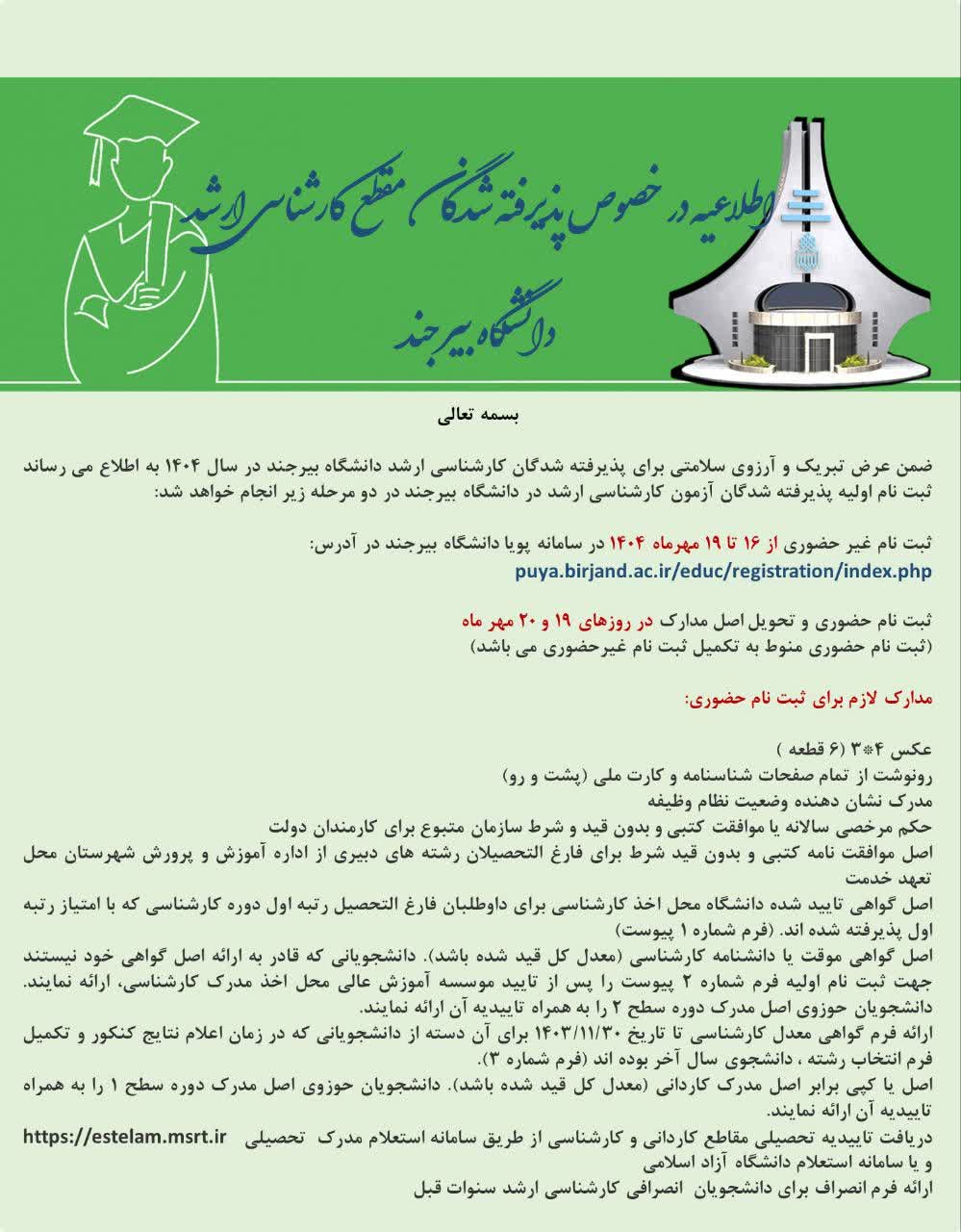 اطلاعیه در خصوص پذیرفته شدگان مقطع کارشناسی ارشد دانشگاه بیرجند ۱۵ مهر ۱۴۰۴ | ۱۳:۰۰ کد : ۳۲۰۲۸ اطلاعیه ها اطلاعیه های مهم ارسال به دیگران نام شما ایمیل شما ایمیل دریافتکننده ارسال انصراف تعداد بازدید:۹۳۱ ضمن تبریک به پذیرفته شدگان کارشناسی ارشد دانشگاه بیرجند در سال ۱۴۰۴ برای اطلاع از فرایند ثبت نام تصویر را مطالعه فرمایید.