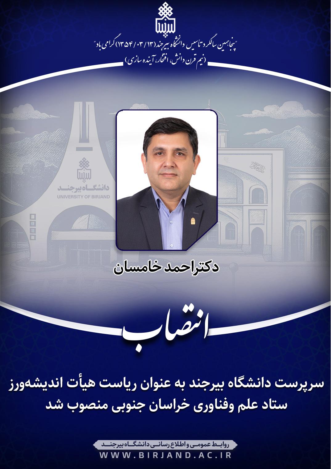 بهگزارش روابط عمومی و اطلاعرسانی دانشگاه بیرجند، در حکمی از سوی حجت الاسلام والمسلمین دکتر عبدالحسین خسروپناه، دبیر شورای عالی انقلاب فرهنگی، دکتر احمد خامسان، سرپرست دانشگاه بیرجند، به سمت ریاست هیأت اندیشه ورز در ستاد علم و فناوری در استان خراسان جنوبی منصوب شد.