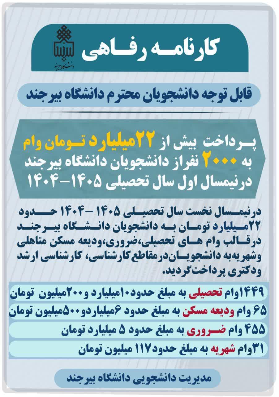 به گزارش روابط عمومی و اطلاع‌رسانی دانشگاه بیرجند، دکتر سامان فرزین، مدیر دانشجویی دانشگاه بیرجند، با اعلام خبر پرداخت بیش از ۲۲ میلیارد تومان وام دانشجویی در نیمسال نخست سال تحصیلی ۱۴۰۵–۱۴۰۴ ، گفت: هدف از پرداخت‌ها این وام‌ها حمایت از دانشجویان و کاهش دغدغه‌های معیشتی آنان است. وی افزود در نیمسال اول سال تحصیلی جاری، حدود ۲ هزار نفر از دانشجویان دانشگاه از انواع وام‌های دانشجویی بهره‌مند شده‌اند و مجموع پرداخت‌ها به بیش از ۲۲ میلیارد تومان می‌رسد.